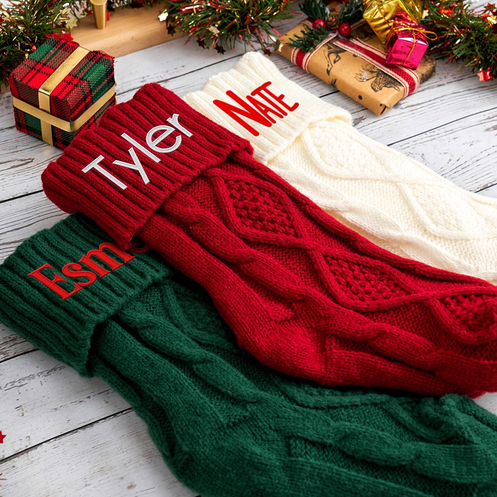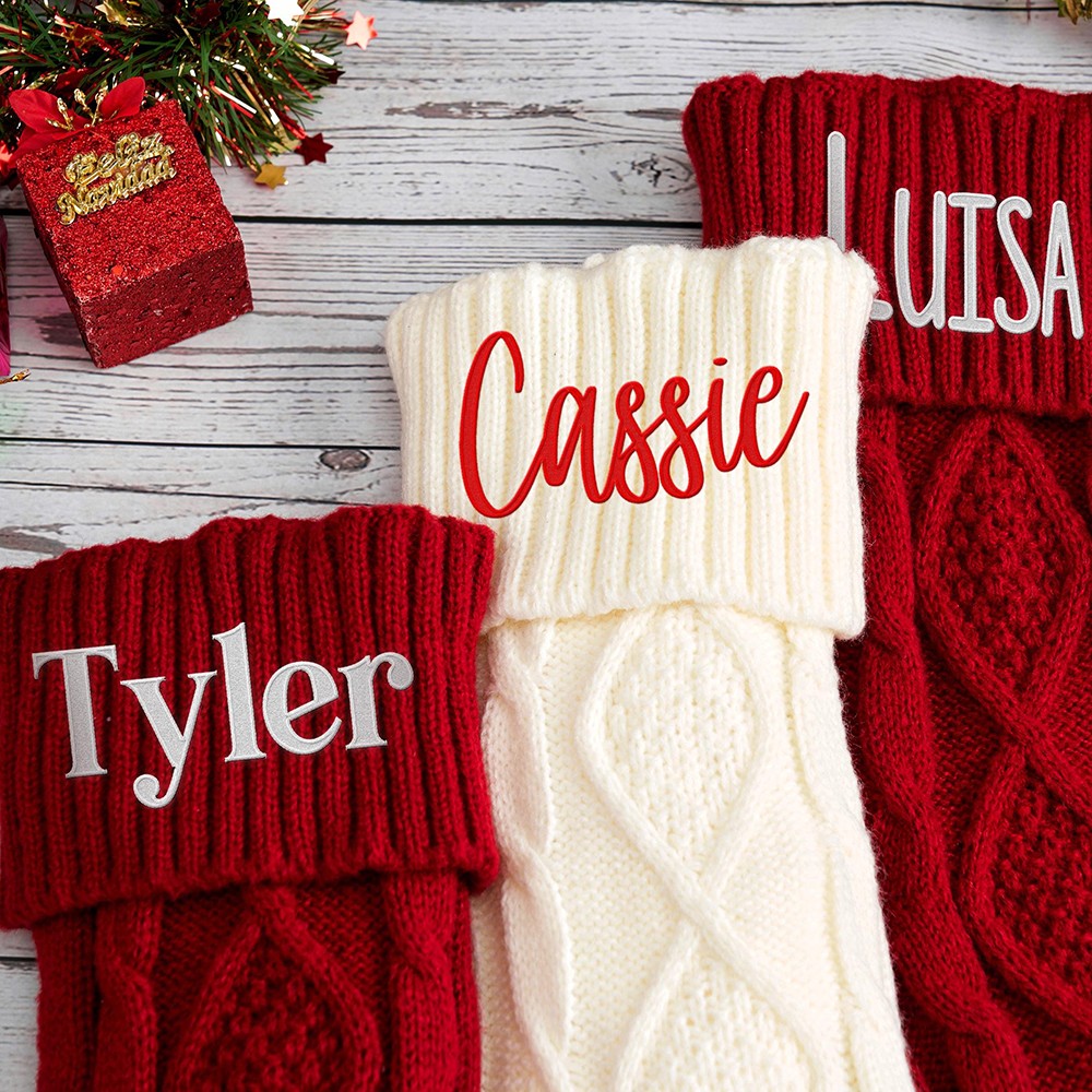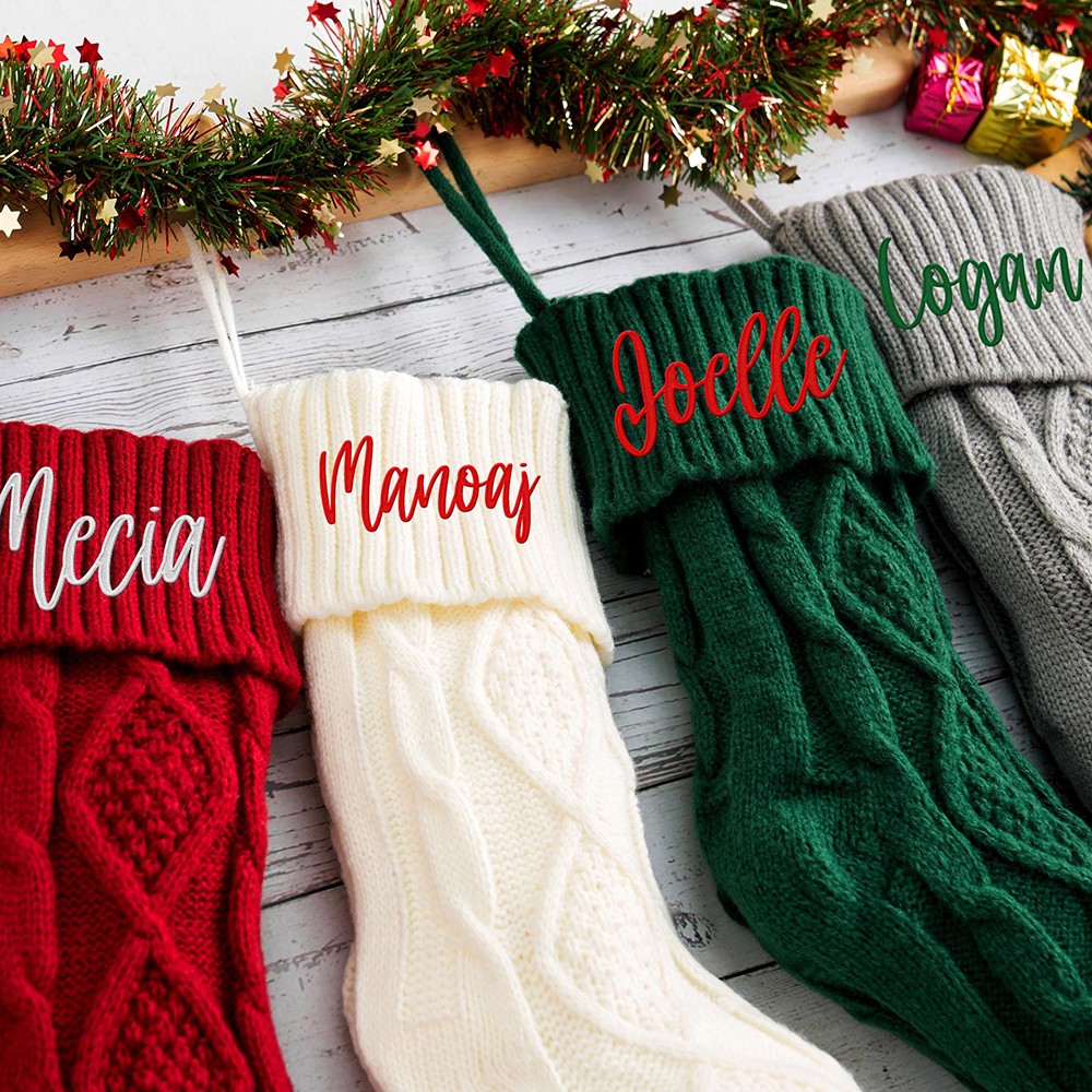 Everyone can enjoy personalized Xmas stockings. Personalized with names or any text to capture the warmth of Christmas.Crafted with care, our twisted knit stockings are soft, comfortable, and thick. The premium leather patches boast elegant stitching. These stockings stretch to accommodate more gifts and regain their fluffy look with a bit of air exposure.
