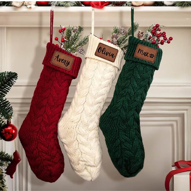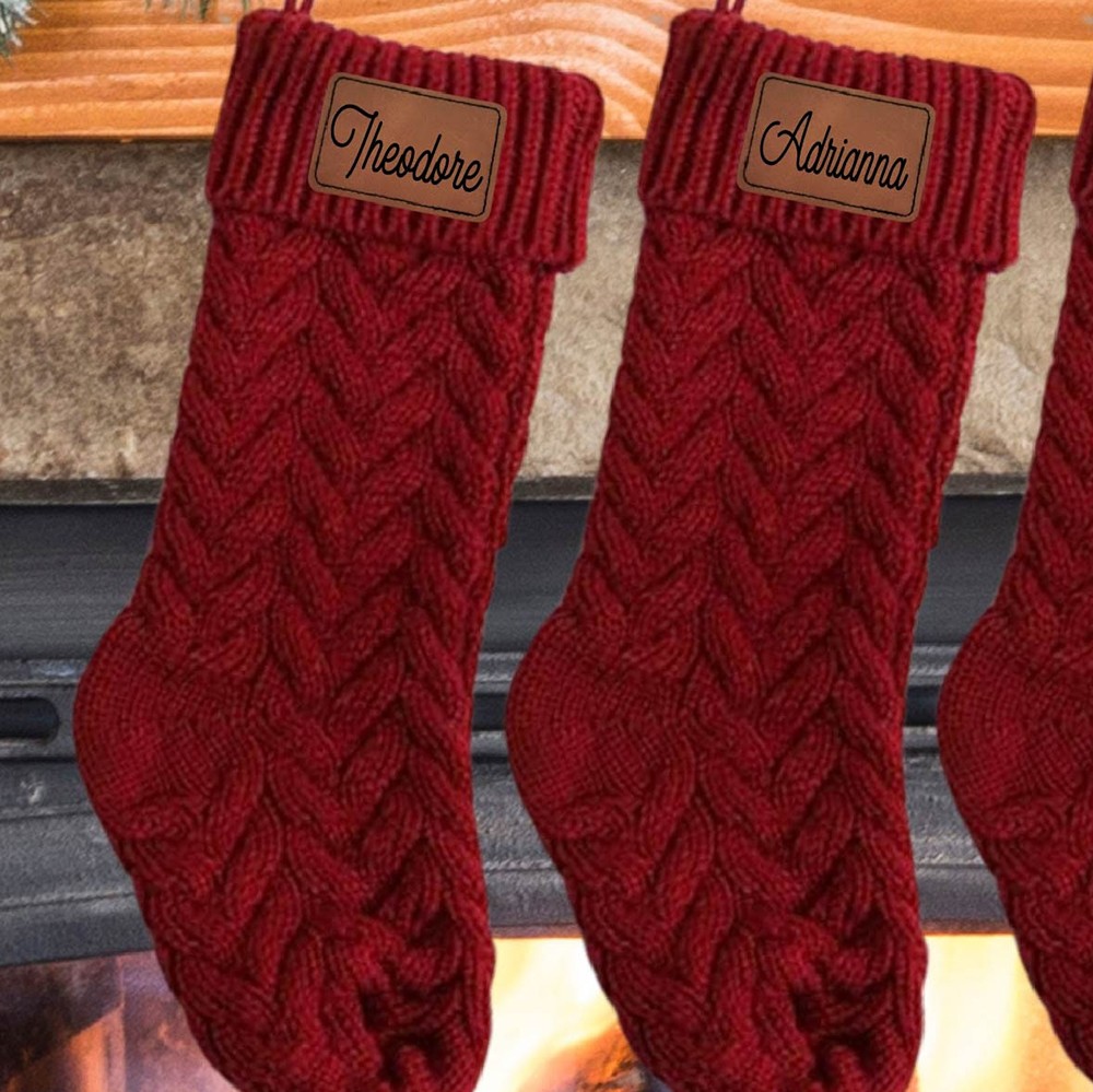 Everyone can enjoy personalized Xmas stockings. Personalized with names or any text to capture the warmth of Christmas.Crafted with care, our twisted knit stockings are soft, comfortable, and thick. The premium leather patches boast elegant stitching. These stockings stretch to accommodate more gifts and regain their fluffy look with a bit of air exposure.